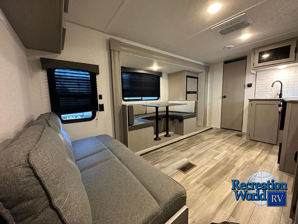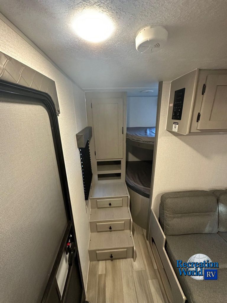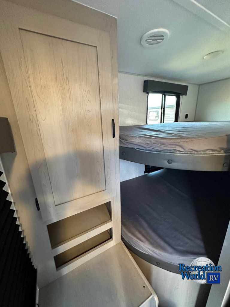The 262BHS is a double-entry model that features a rear bunk room with east-to-west bunk configuration and storage steps entry, including a large open-space concept rear living with both a jack-knife sofa, u-dinette, and private front-end bedroom. The non-camping side features a u-dinette plus and extra-large 11 cu. ft. refer across from the entertainment center and kitchen. The front bedroom comes with a walk-around RV queen bed and hidden storage.