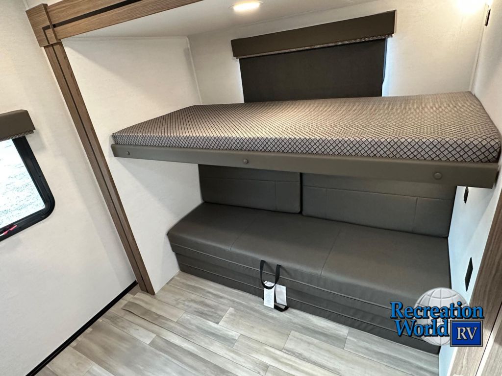 The beautiful Delta 321BH (bunk house) can sleep the whole crew comfortably. Starting with the main attraction, the bunk house offers a bunk bed setup along the campside, and another bunk with a cube sofa underneath on the opposite. This is a great trailer for a large crew! Moving through the unit, the living room slideout features a three-seater couch next to the 12 volt refrigerator for easy access to cold drinks while watching the big game on the 40″ HDTV across the way. Underneath the TV is an atrium window and a four-seater dinette for all the views. Next, the wraparound kitchen features a large countertop, three burner cooktop stove, microwave, and stainless steel sink. Down the hall is a bathroom which includes a porcelain toilet, 30″x36″ shower, and a sink with tons of storage. Right next to the bathroom is the main bedroom which offers a queen sized bed and ample storage around, above, and under the bed. Lastly, in the main bedroom is a wardrobe with even more storage to dress those adventures. On the exterior of the coach, you’ll have plenty of shade with the 8′-6″ and 12′ awnings, an easy way to wash off mud with two hoses on either side, a 6 foot folding camp table, and a 200 WATT solar panel. What more do you need for your family adventures?
