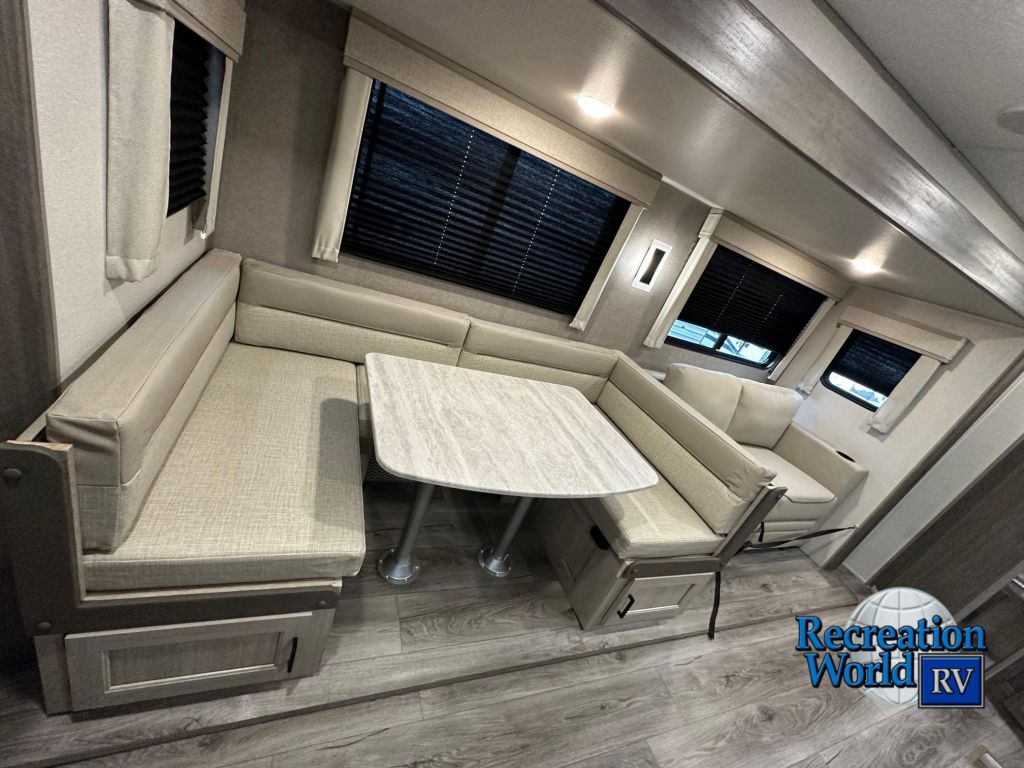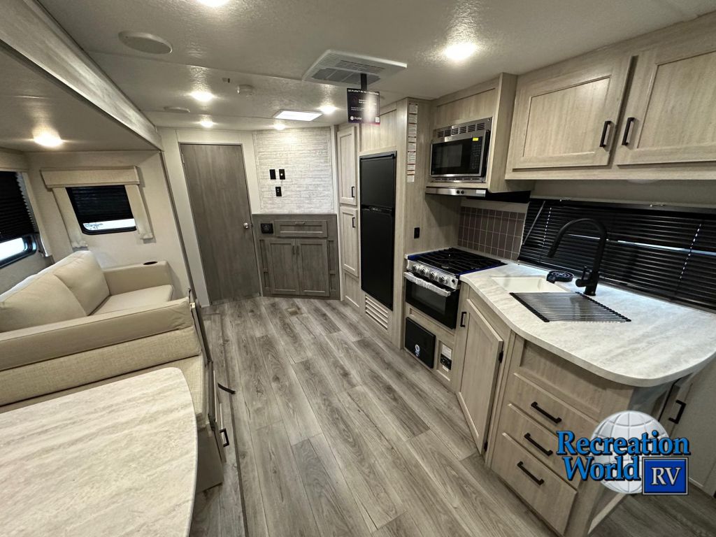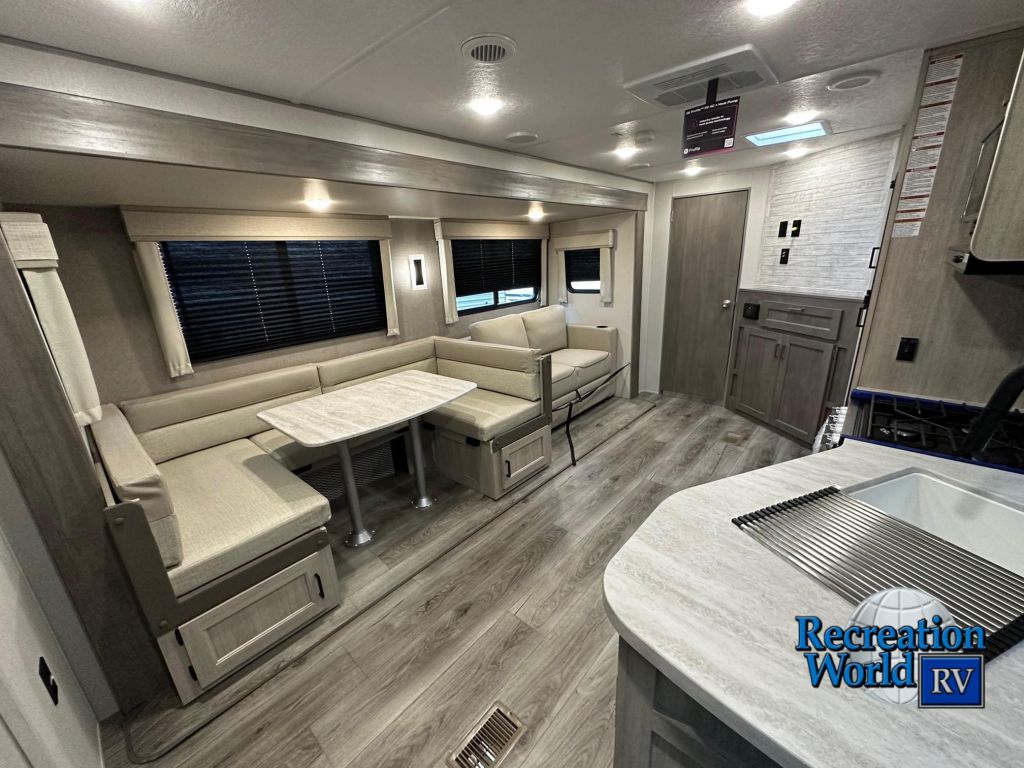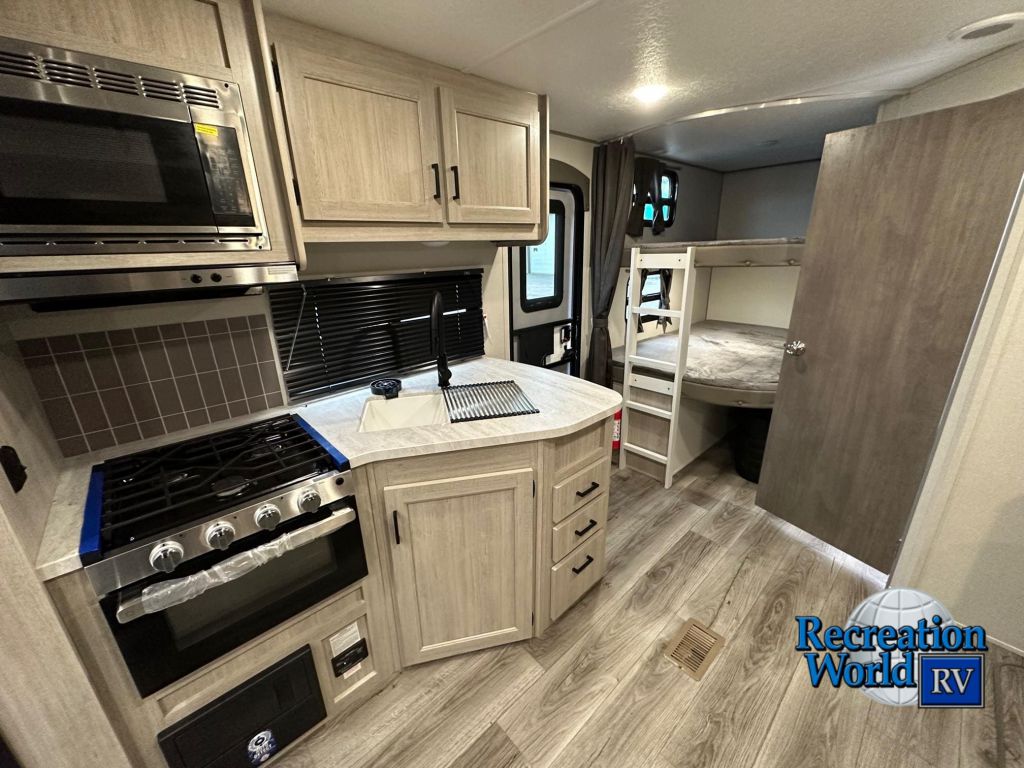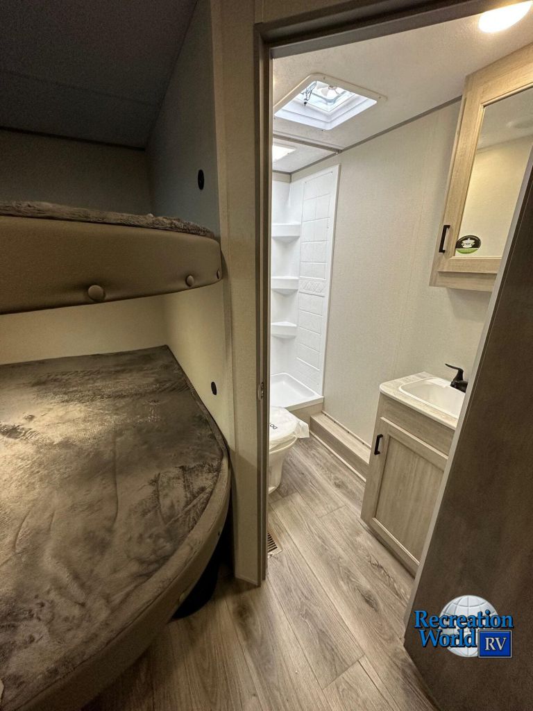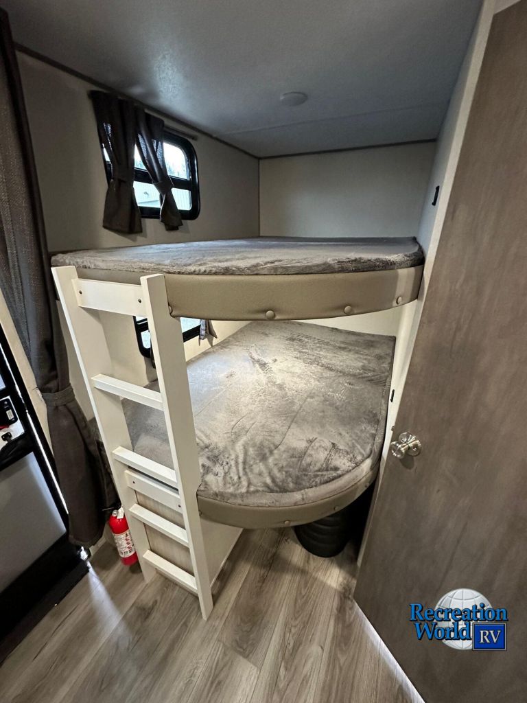 The 263BHS is a classic family bunk house floorplan. Plenty of sleeping is provided by a queen bed in the private master bedroom, two spacious double-over-double bunk beds, as well as our extra-large U-shaped dinette and jiffy bed sofa. Well thought-out features including the easy view angled entertainment center, generous kitchen pantry and standard outside camp kitchen. Additional storage spaces include the under-bunk cubby and floor-to-ceiling closet in the master bedroom.