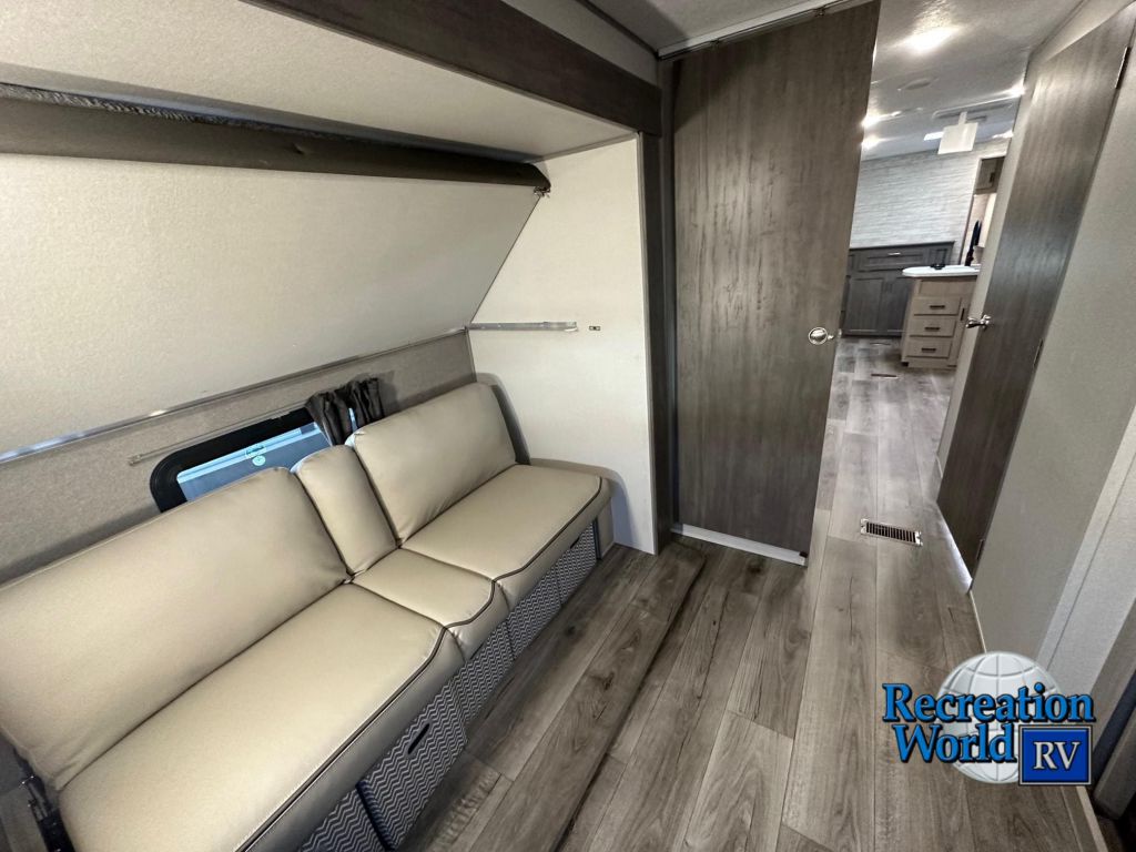 The 323BHDSCK is the ideal bunkhouse floorplan for families of all sizes! The bunk room is furnished with a double size loft bed, a single bunk that can be stowed for more room, the versatile COA cube lounge futon, its own ent. center, and abundant storage. The living room provides a large U-shape dinette and substantial pantry to meet the needs of any family. On the outside our standard large camp kitchen includes a griddle, dorm style refrigerator, sink, plus storage cabinets and drawers.