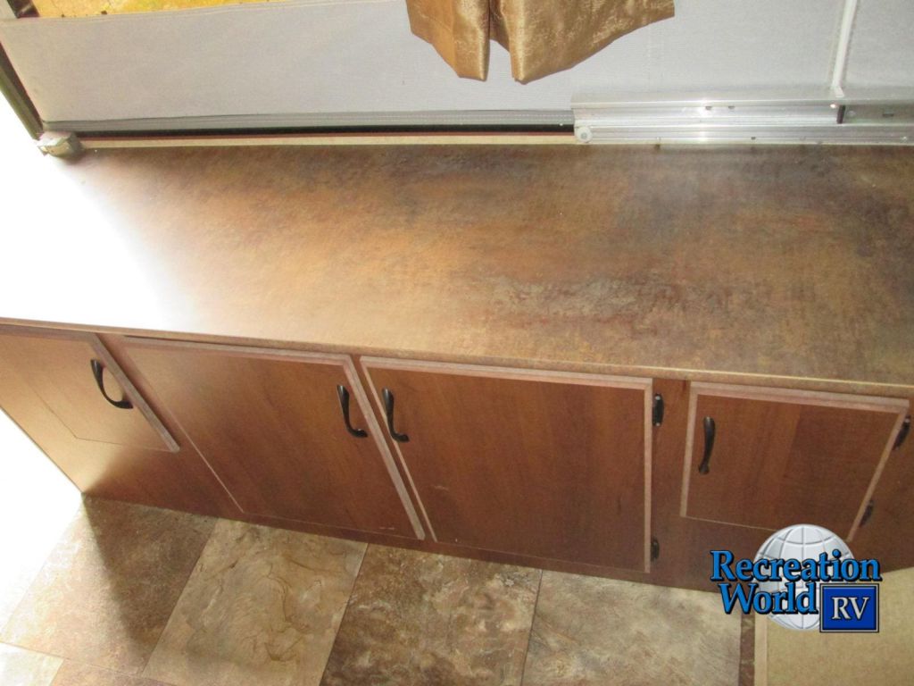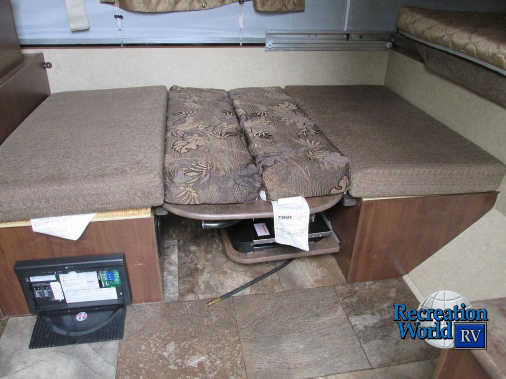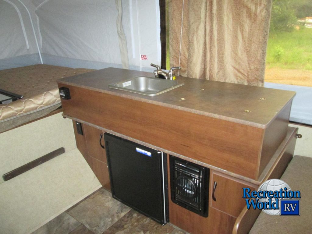 As you enter the camper, to the left there is a large storage cabinet. To the right of the entrance you will find a second storage cabinet. The opposite side of the camper offers a dinette, two burner range, and sink.